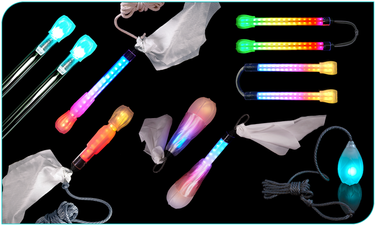 All flowtoys tubing-based props like batons, staffs, chucks, darts, flower sticks and tubing-based poi have a "flowcap" securing your lights inside the protective tubes.
